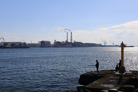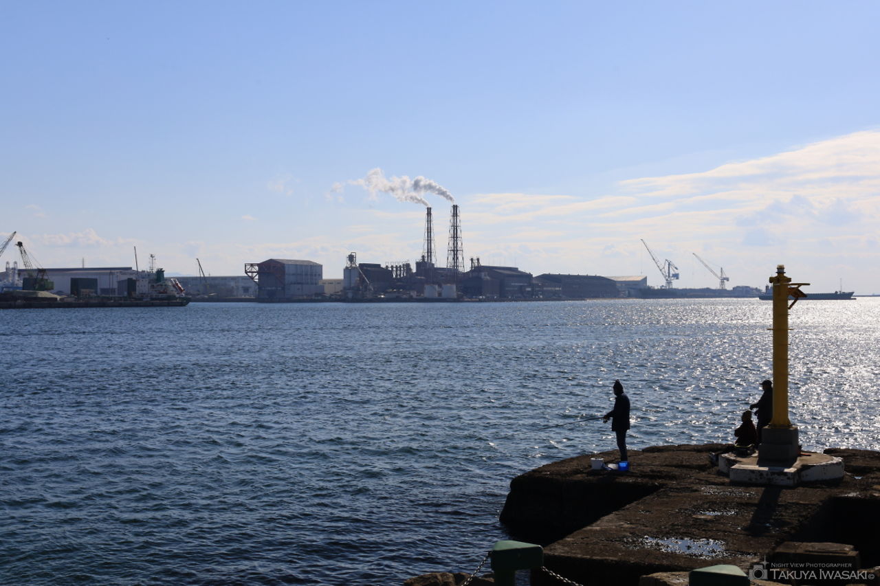 釣り人で賑わう「東播磨港高砂西防波堤灯台」の手前がビューポイント。神戸製鋼やカネカ高砂工業所の工場夜景が見渡せます。