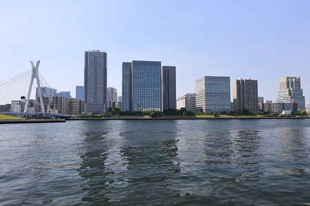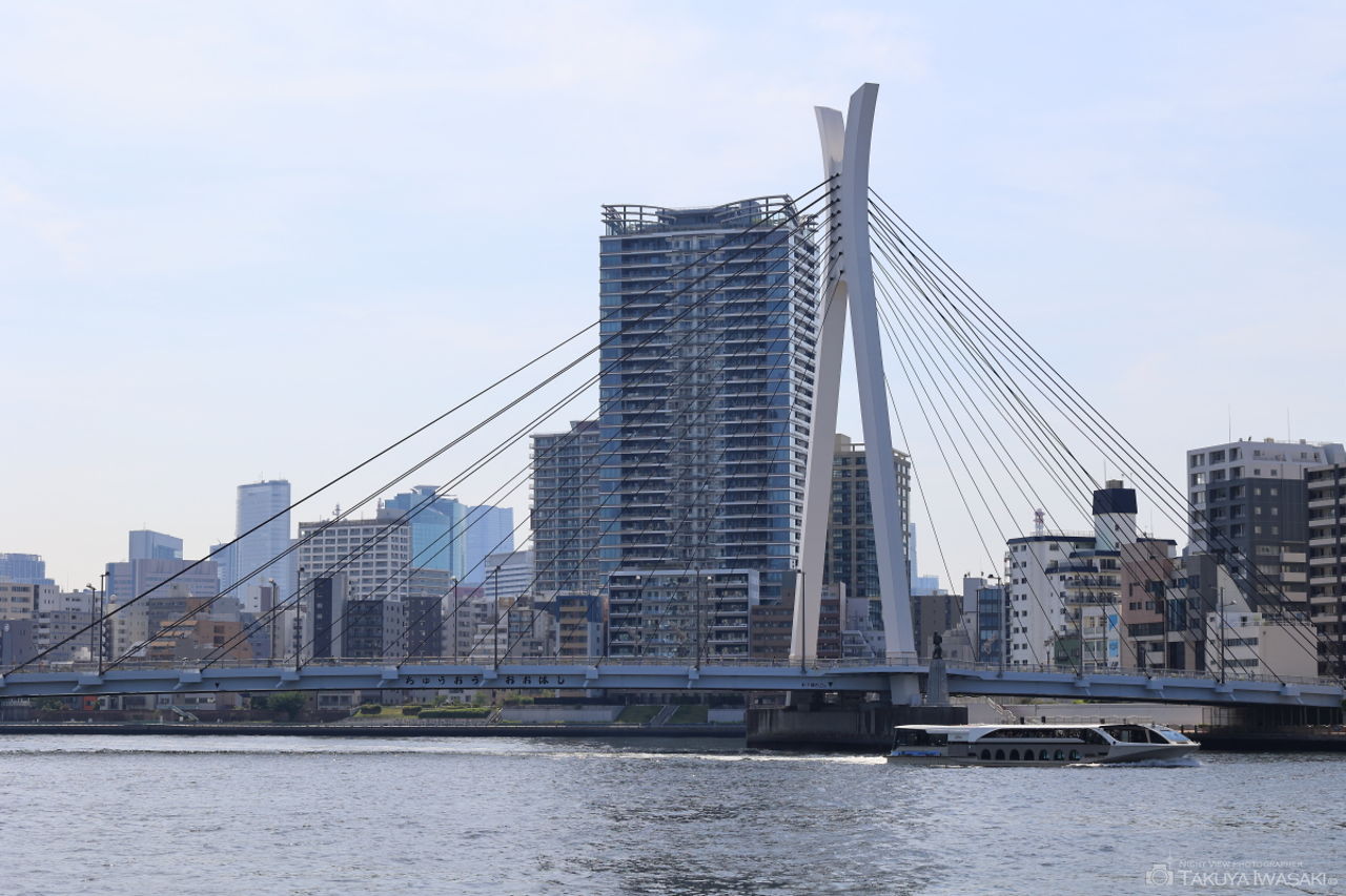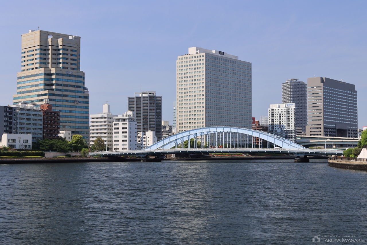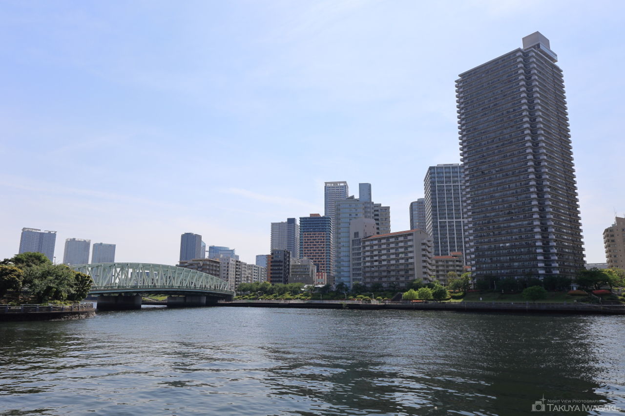 東京スカイツリーと永代橋を観賞できるビューポイント。中央大橋も21時頃までライトアップされており、開放感ある歩道は散歩コースにもおすすめです。