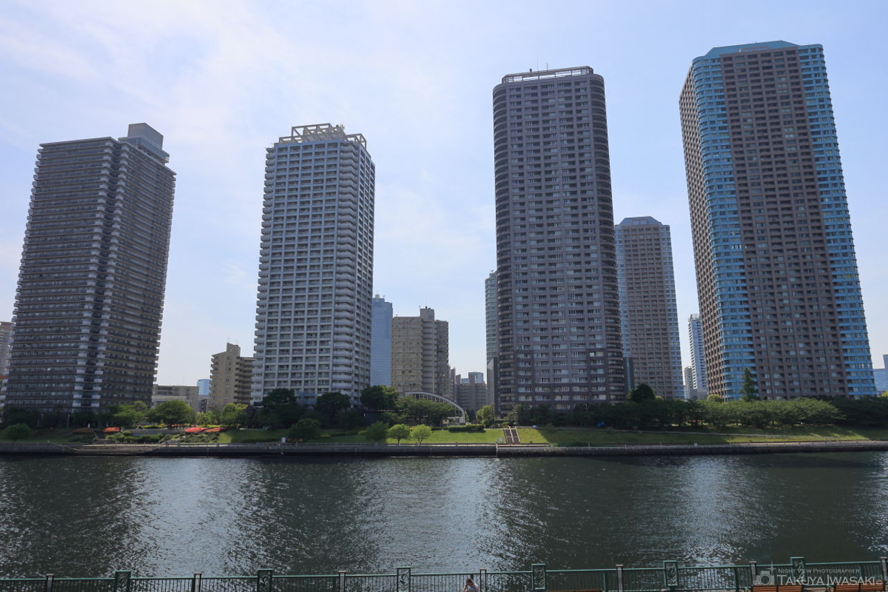 石川島公園は大川端リバーシティ21のウォーターフロントにあり、雰囲気の良い広場から中央大橋・永代橋・東京スカイツリーなどの夜景を観賞できます。
