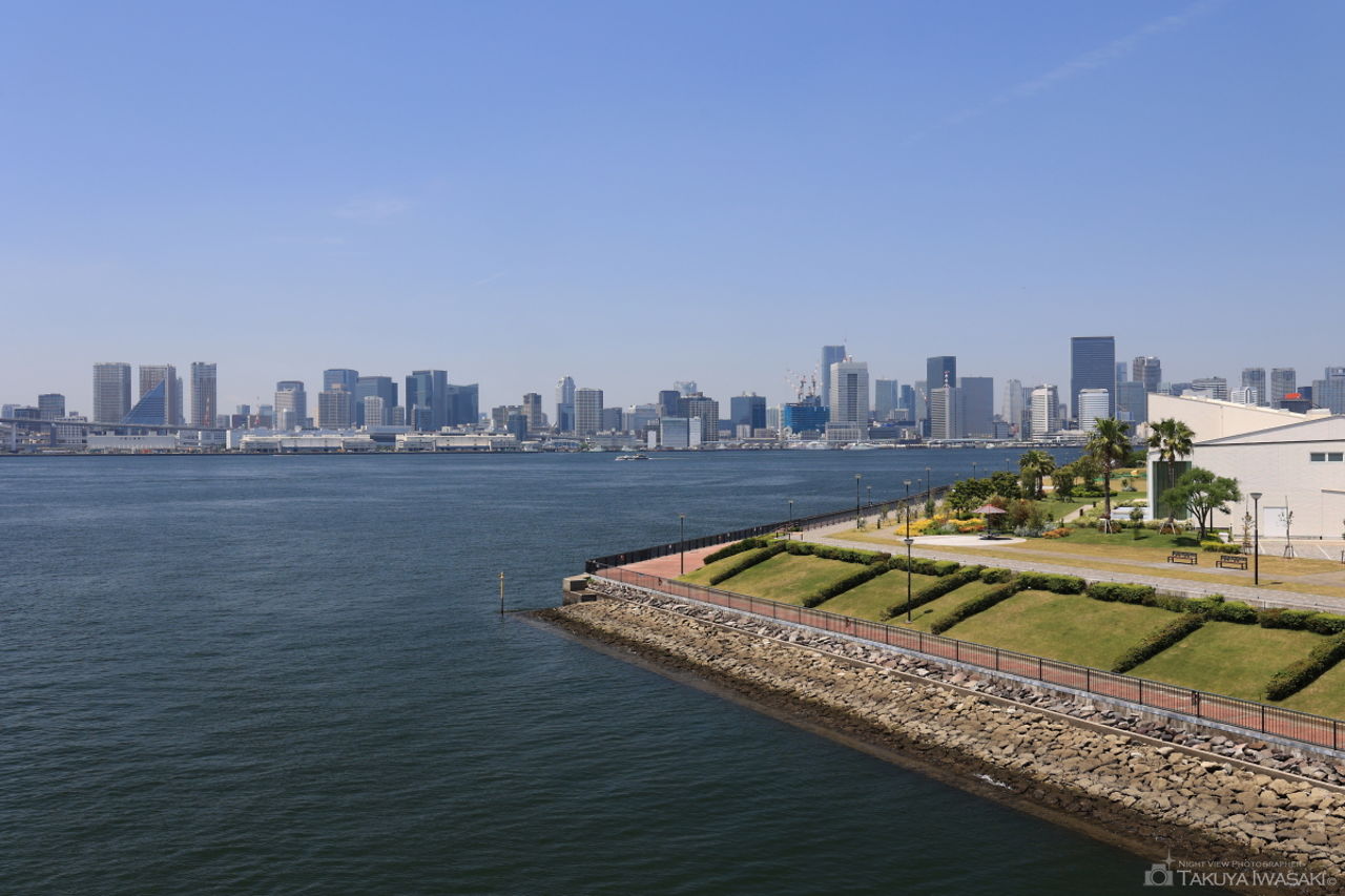 2017年4月に全面供用した開放感ある公園。北側にある休憩所からはレインボーブリッジや東京都心を眺められ、撮影にもデートにもおすすめ。