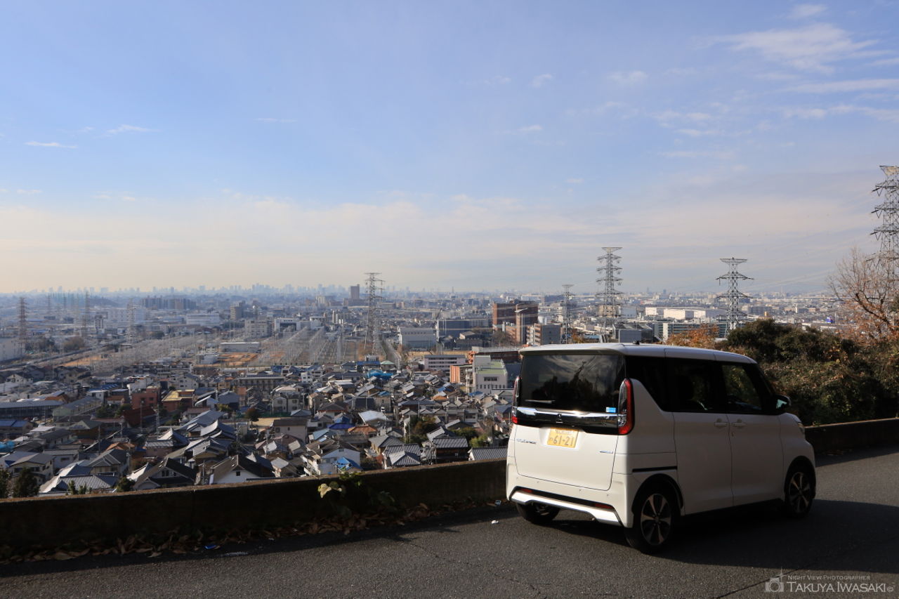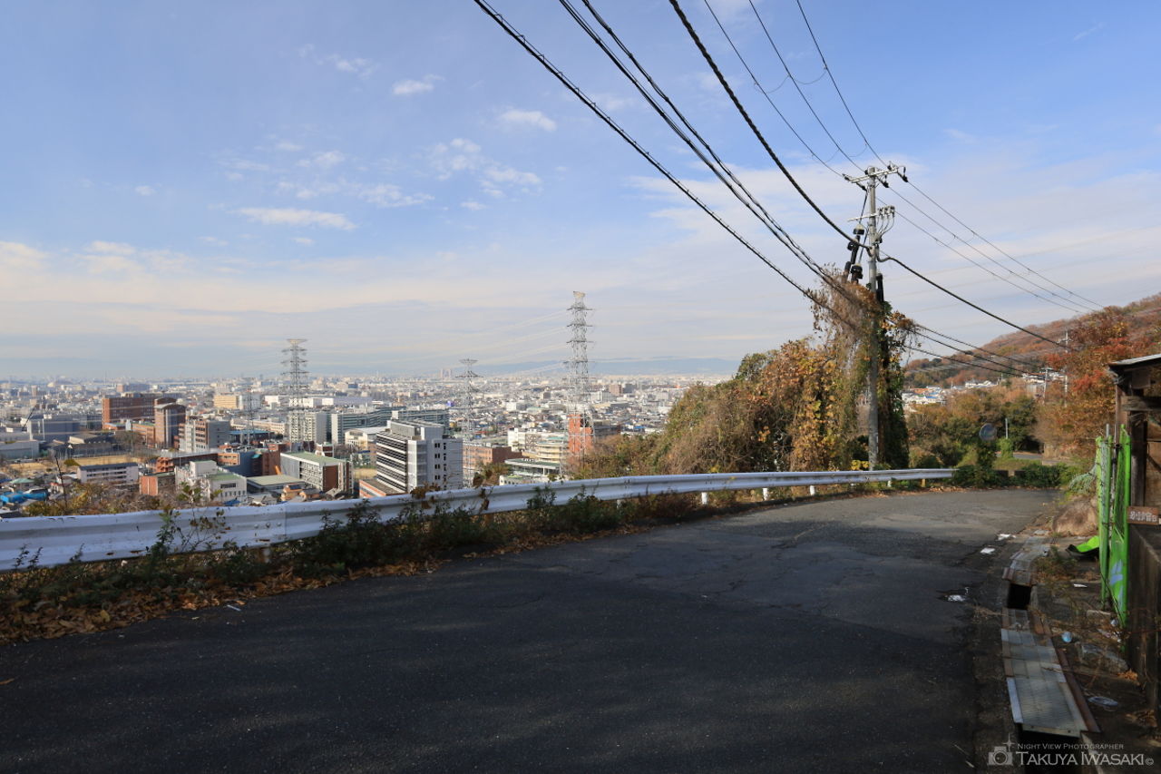 近鉄電車に乗り、石切駅にたどり着くまでにも車窓からの夜景が楽しめますが、駅を降りて北へ歩くこと約2分。視界一面に大阪平野の夜景が広がります。