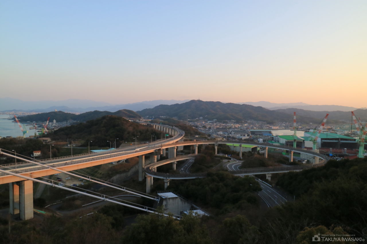 亀老山展望公園にある展望台から今治市や吉海町方面の夜景を見渡せます。来島海峡大橋のライトアップが眺められる場所としても有名です。