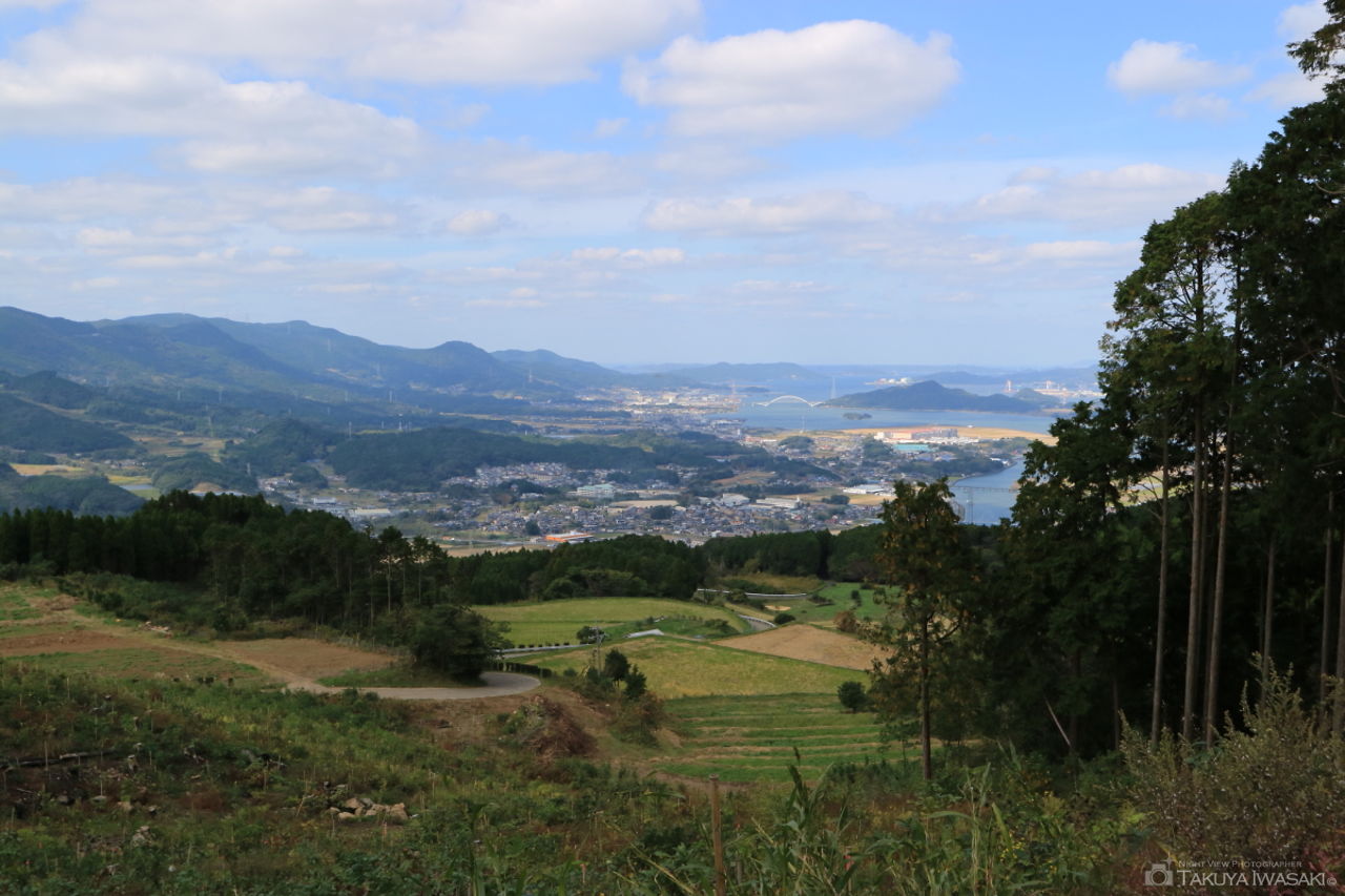 竹の古道公園に繋がる道路がビューポイント。展望台などはありませんが、伊万里湾を中心とした夜景が広がります。