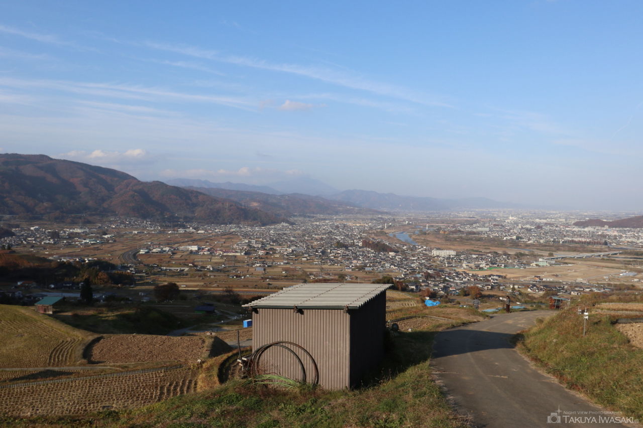 棚田を眼下に、遠くには千曲市の夜景が広がります。高さがあることから迫力ある夜景が見渡せ、時期によっては棚田のライトアップも楽しめます。